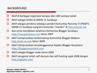 Dokumen ini menjelaskan tentang SEO untuk pemula, termasuk prasyarat untuk mulai nge-blog dan pentingnya optimasi mesin pencari. Gempur Abdul Ghofur memberikan langkah-langkah dan teknik yang dapat diterapkan untuk meningkatkan visibilitas blog di mesin pencari. Selain itu, dia juga menekankan bahwa kesuksesan blogging memerlukan konsistensi dan kerja keras.
