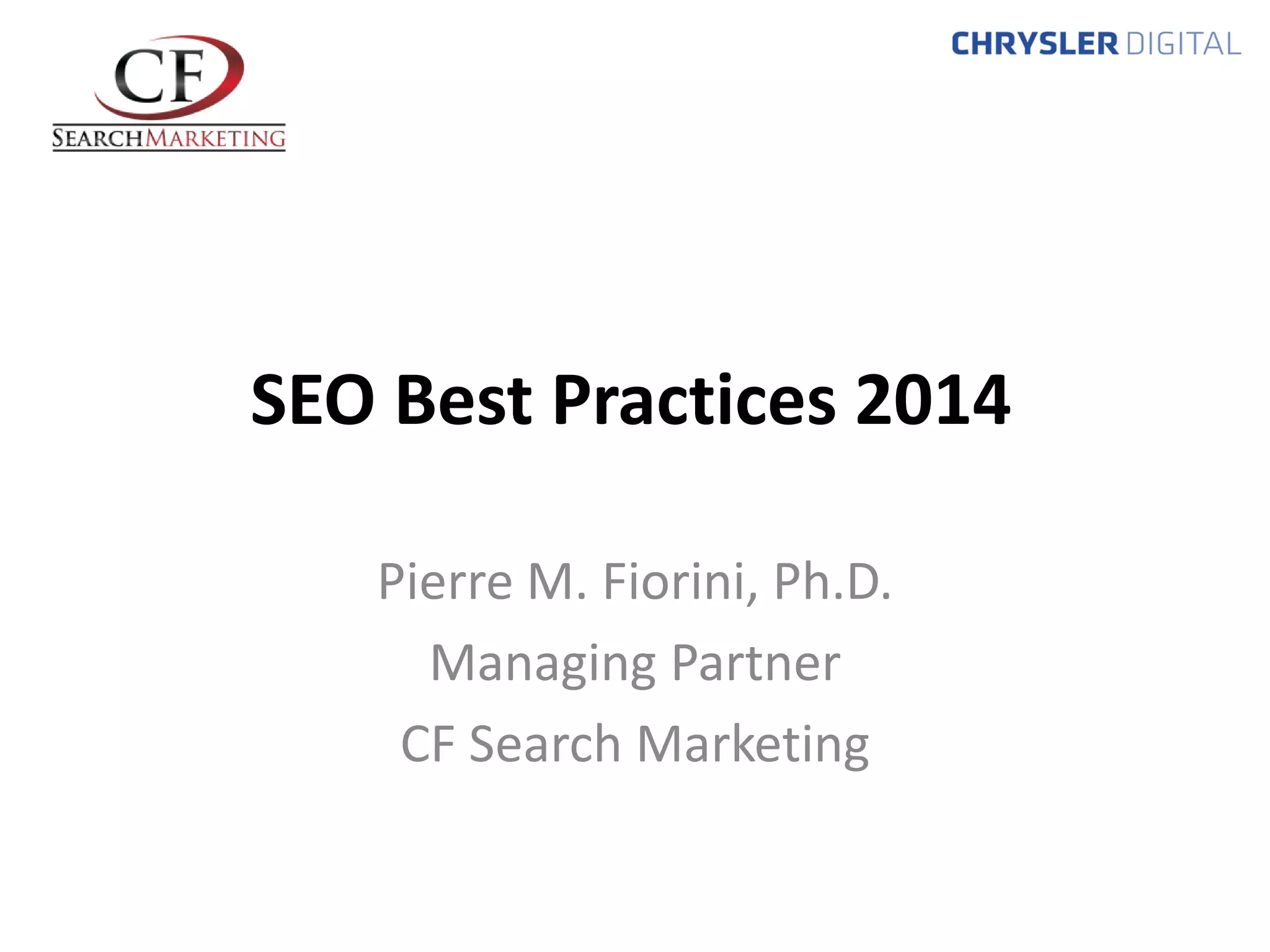 CF Search Marketing is a digital marketing agency founded in 2007 with two locations in Miami and Portsmouth. They have been a preferred vendor for Chrysler since 2013 providing SEO, social media, and reputation management services. The document discusses SEO best practices for 2014 including the importance of on-page optimization, off-page link building, generating local and social signals, implementing a mobile strategy, and leveraging SEO and paid search synergies. It also covers how Google's algorithm has changed in recent years to favor unique, high-quality content and more natural linking practices.