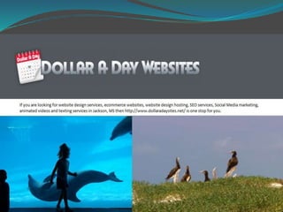 This document advertises Dollar A Day Websites as a one-stop shop for various web development and digital marketing services located in Jackson, MS, including website design, ecommerce websites, hosting, SEO, social media marketing, animated videos, and texting. It provides their phone number, website, and email for contact information.