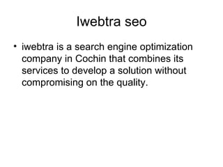 Iwebtra is a search engine optimization company located in Cochin, Kerala, India that provides various web services and software solutions including development, design, and SEO. They aim to meet clients' business needs on time, within budget, and with high quality. Iwebtra's Cochin office contact information is provided for clients to learn more about their services.