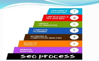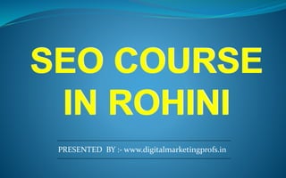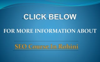 The document provides information about an SEO course offered in Rohini, Delhi. The 3 month course covers on-page and off-page SEO techniques through practical live projects. It is suitable for graduates and undergraduates from any field. The syllabus includes keyword research, content marketing, technical SEO, link building, analytics, and more. Students will learn from industry experts to gain skills needed for a fast growing career in digital marketing.