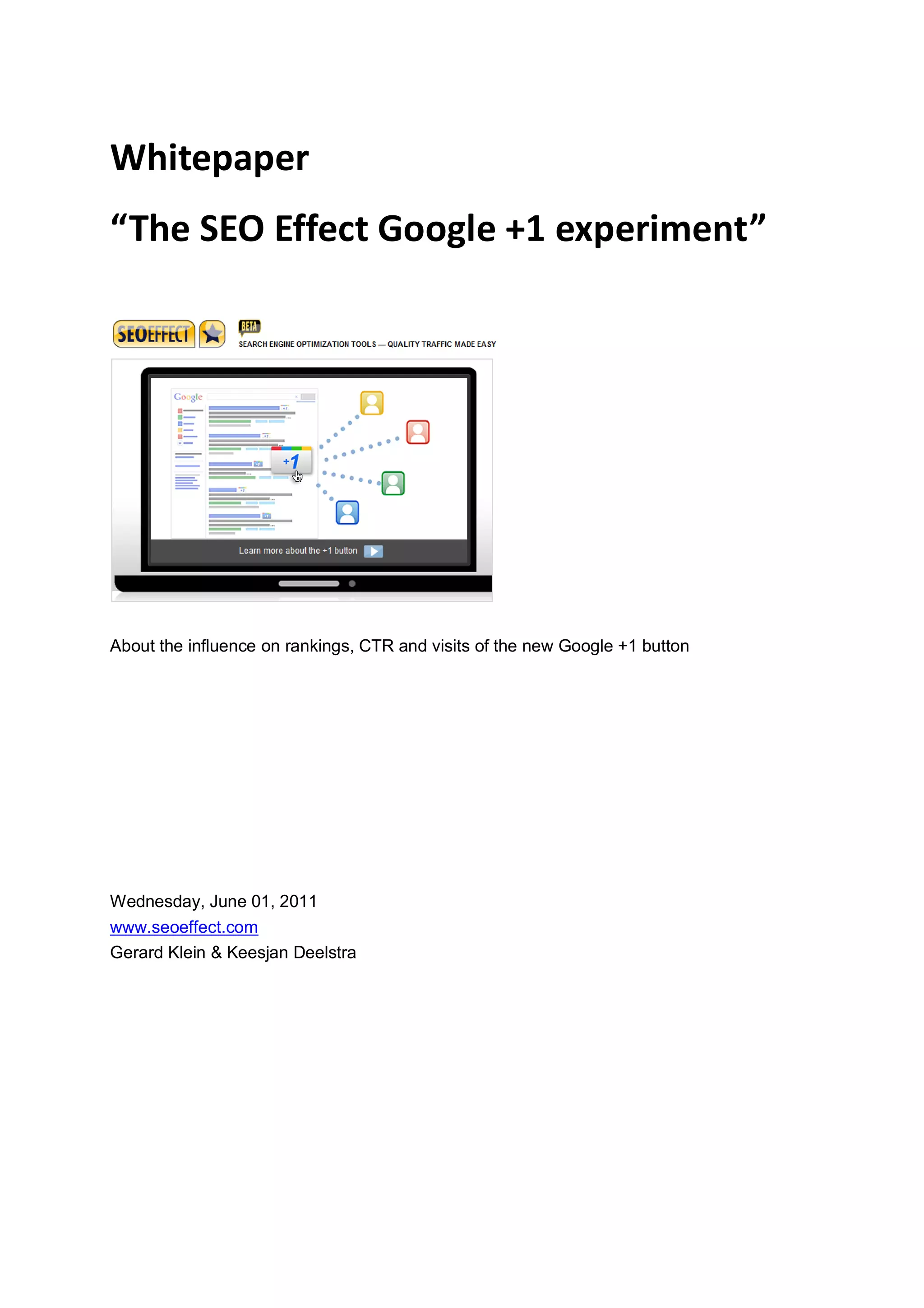 The whitepaper discusses an experiment conducted by SEO Effect to analyze the impact of Google's +1 button on search rankings, click-through rates, and website traffic. The findings indicate that +1 markings can improve search visibility and increase traffic by approximately 20% due to higher impressions and click rates. The document also emphasizes the importance of integrating the +1 button on websites to maximize its benefits.