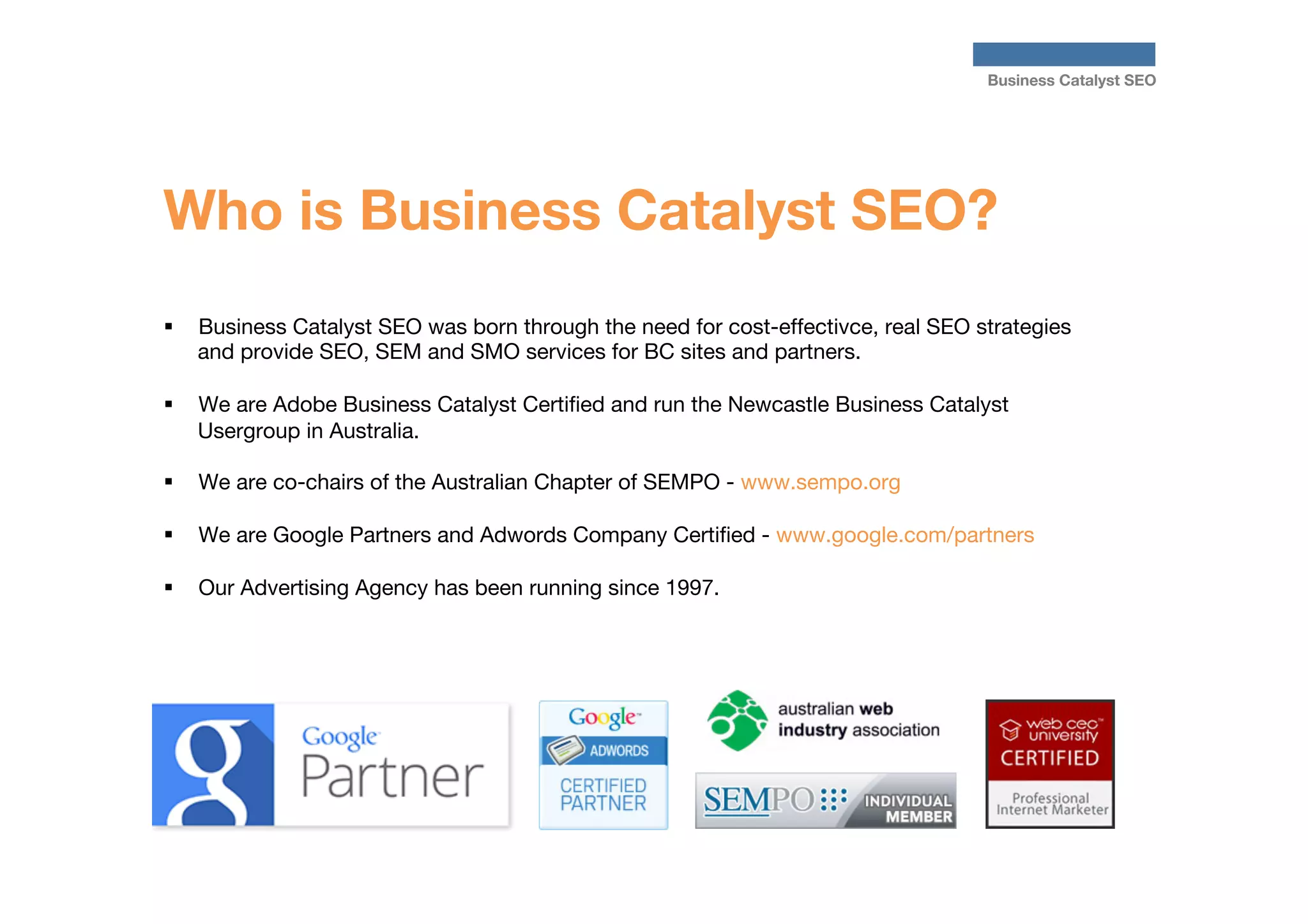 This document provides information on SEO best practices for websites built with Adobe Business Catalyst. It discusses topics like on-page SEO elements like H1-H6 tags, page text, tooltips, alt text and URLs. It also covers off-page elements like metadata, XML sitemaps, redirects and more. The document aims to show that Business Catalyst has integrated tools that make SEO simple and automated for optimized website visibility.