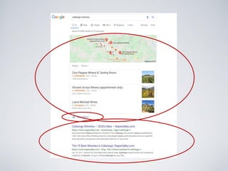 The document discusses key factors for local SEO success. It identifies five main areas of focus: Google properties like Google My Business; reviews from sources like Google and Yelp; citations from other websites; backlinks from local sources; and an optimized local business website. It provides tips for each area, such as claiming profiles on all major directories, filling out information fully, asking for reviews frequently, getting backlinks from local non-profits, and ensuring a fast mobile site. The goal is to influence local search rankings and drive more clicks, calls and customers to local businesses.