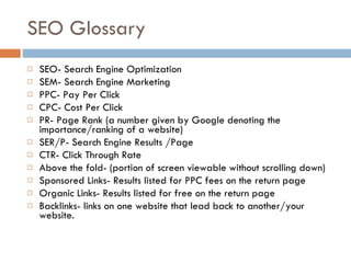 This document outlines the fundamentals of search engine optimization (SEO) and its significance in real estate internet marketing, emphasizing the importance of organic listings over paid ones. It presents statistics on internet search behavior, highlighting Google's dominance in search traffic and the visibility issues many websites face. The document also suggests a structured approach to enhance online marketing strategies through SEO assessments and targeted keyword optimization.