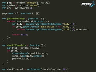 This document discusses SEO challenges for single-page applications (SPAs) and solutions for making SPAs crawlable by search engines. SPAs work well for users but not search bots because bots only see empty HTML pages without rendered content. The document recommends using a headless browser to render the SPA on the server and return fully rendered HTML to search bots. This allows bots to index the site properly. Several JavaScript frameworks that support server-side rendering out of the box are also discussed, including Derby.js, Meteor.js and Atma.js. The document concludes by addressing questions about improving rendering delays and monitoring loading in SPAs.