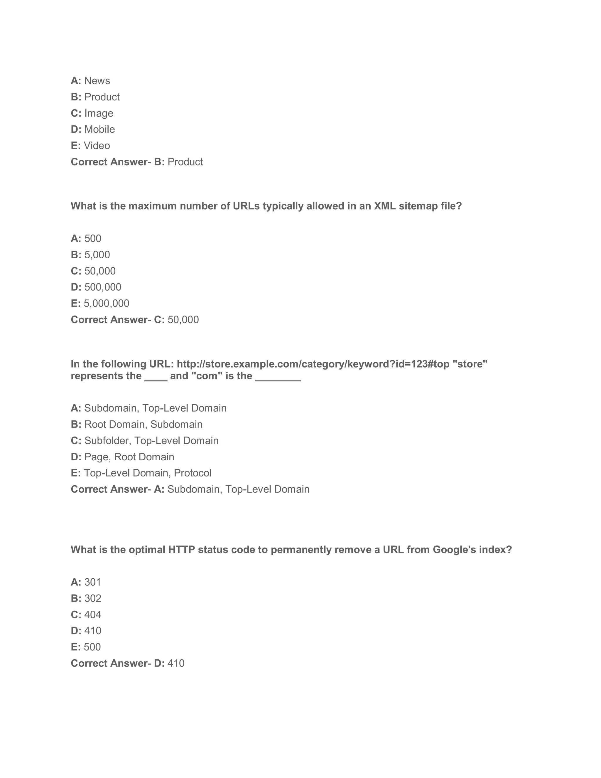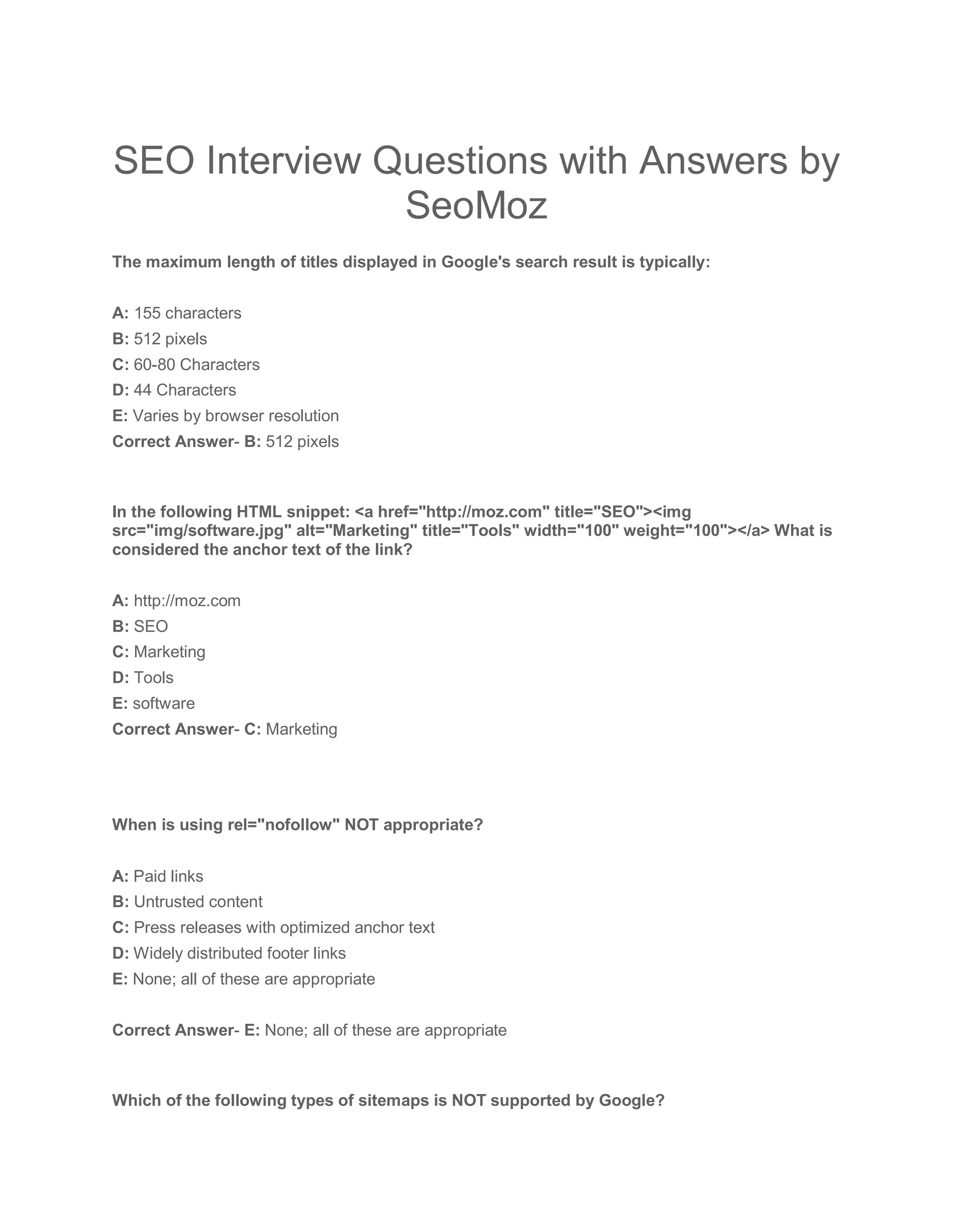The document contains a series of SEO interview questions along with their correct answers, focusing on topics such as title lengths in Google search results, anchor text, HTTP status codes, best practices for sitemaps, and SEO tactics like canonical tags and mobile vs. desktop search trends. The queries cover fundamental SEO concepts and technical details crucial for optimizing web content and improving search engine rankings. It serves as a comprehensive resource for preparing for SEO-related interviews.