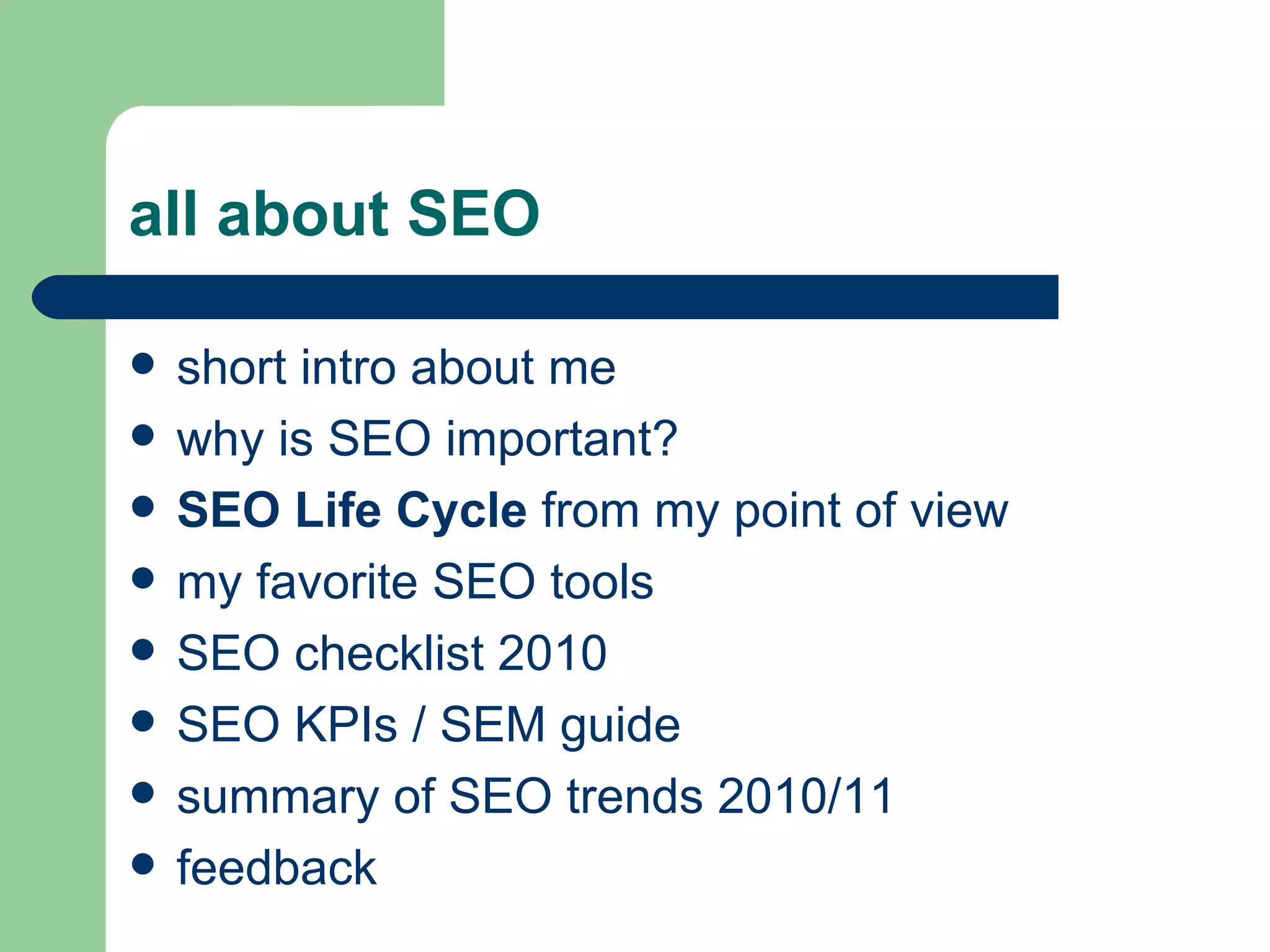 The document discusses the importance of SEO, emphasizing its role in helping customers find information quickly through effective search engine strategies. It outlines the SEO life cycle, including setup, analytics, and tools, while providing insights into current trends and key performance indicators. The author shares resources and personal reflections on SEO practices and the integration of social networks into SEO strategies.