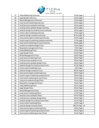 The document reports on search engine optimization (SEO) efforts for Tier4 Health Care. It includes keyword rankings, with most terms not ranking in the top 300 results. It outlines on-page and off-page optimization techniques used. Traffic data is also presented, showing the most viewed pages and social media activity on platforms like Facebook, Twitter, Google+, and Pinterest during a one month period.