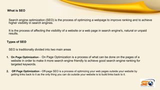 The document provides a comprehensive overview of SEO, focusing on on-page optimization techniques essential for improving website visibility in search engine results. Key components include title optimization, meta tags, keyword research, internal and external linking, URL structuring, and content quality. Proper implementation of these strategies is crucial for achieving higher rankings and enhancing user experience on websites.