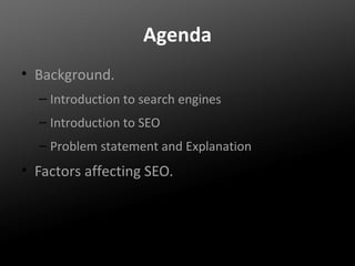 This document provides an introduction to search engine optimization (SEO). It explains that SEO is the process of improving websites to rank higher in search engines for targeted keywords. On-page optimization focuses on technical elements like HTML tags, website structure and script usage. Off-page optimization involves other techniques like link building, email marketing and advertising. Key ranking factors for search engines include internal link structure, link popularity and relevance, crawlability, and content relevance. Popular SEO tools are also mentioned that provide features like ranking monitoring, backlink management, and search engine data analysis to optimize websites.