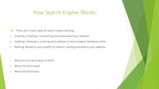 The document discusses search engine optimization (SEO) techniques to enhance website rankings in organic search results, explaining key components like search engines, crawling, indexing, and ranking. It outlines types of keywords, on-page optimization elements such as title and meta tags, keyword mapping, and image optimization. Additionally, it mentions the importance of sitemaps and tools for performance assessment.