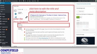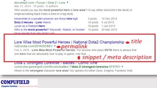 Search engine optimization (SEO) involves optimizing webpages so they rank higher in search engine results. On-page SEO factors that websites can control include keywords in page titles, meta descriptions, images, URLs, and linking structures. Off-page factors like backlinks that websites cannot fully control are also important signals of relevance. The goal is to understand how search algorithms work and provide relevant, high-quality content to users.