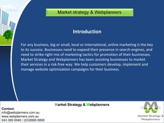 Market Strategy & Webplanners is a digital marketing agency that assists businesses with online marketing strategies including search engine optimization, website design and development, pay-per-click advertising, and social media marketing. They help customers increase their online visibility, website traffic, and search engine rankings through customized digital marketing campaigns. Their services are designed to promote business growth in a cost-effective manner and they guarantee a return on investment for clients.