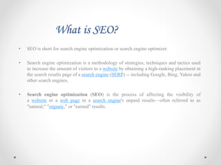 The document provides an overview of search engine optimization (SEO), detailing its definition, history, and the methodologies utilized to increase website visibility in search engine results. It contrasts black hat and white hat SEO techniques, outlines on-page and off-page SEO components, and emphasizes the importance of keyword research and proper website planning. Additionally, it discusses SEO best practices, Google algorithms, and strategies for enhancing domain and page authority.