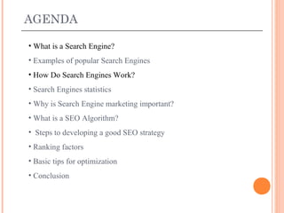 This document provides an overview of search engines and search engine optimization (SEO). It defines what a search engine is, examples of popular engines like Google, and how they work by crawling websites, indexing content, and ranking pages using algorithms. The document outlines why SEO is important for getting relevant traffic, and covers SEO strategies like researching keywords, optimizing on-page elements, and building quality backlinks. Basic tips are provided for technical optimization and ethical SEO practices.