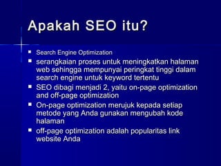 Dokumen tersebut memberikan penjelasan mengenai optimisasi mesin pencari (SEO), termasuk proses on-page dan off-page optimization untuk meningkatkan peringkat situs web dalam hasil pencarian mesin pencari seperti Google. Beberapa teknik yang disebutkan meliputi pemilihan kata kunci, penggunaan title dan meta tags, serta menempatkan kata kunci di bagian tertentu halaman web.