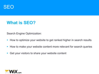 2. Key aspects of SEO include choosing relevant keywords, optimizing titles, descriptions and content with those keywords, and keeping content fresh and encouraging sharing.