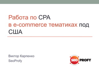 Документ обсуждает различные подходы к CPA (cost-per-action) в e-commerce для рынка США, выделяя черные, серые и белые ниши. Он акцентирует внимание на важности трафика для успеха и описывает несколько практических кейсов, таких как образование, взрослые знакомства и туристическая тематика. Различные стратегии получения трафика и взаимодействие с партнерами представлены как ключевые аспекты работы в данной области.