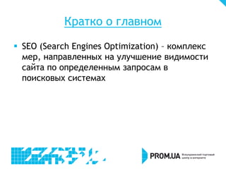 Документ описывает SEO (оптимизацию для поисковых систем) как метод повышения видимости сайтов, подчеркивая его долгосрочные преимущества и недостатки, такие как отложенный результат и нестабильность из-за изменений алгоритмов. Освещаются этапы SEO-оптимизации, включая внутреннюю и внешнюю оптимизацию, а также важность подбора ключевых слов и контента. Также упоминаются инструменты и стратегии для эффективного продвижения на платформе prom.ua.