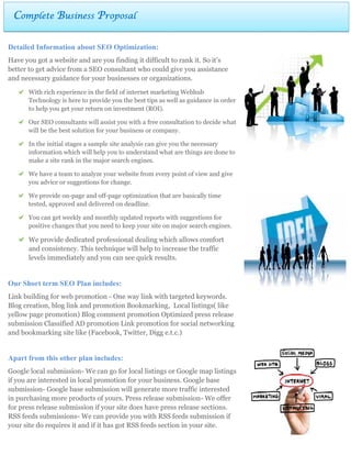Webhub Technology provides SEO optimization, reputation management, and social media optimization services. They welcome potential clients and introduce their company as an ethical web design and SEO agency in Kolkata. They promise to deliver excellent web design and SEO services to help clients' businesses reach the top of their industries. They believe in client satisfaction and have quality improvement policies and an efficient online marketing team. The proposal provides detailed information on their SEO optimization services, packages and pricing, planning and outreach strategies, and contact details.