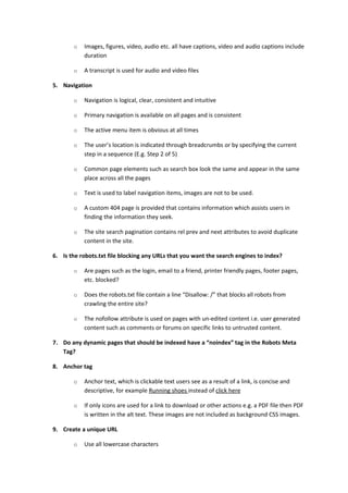 The document provides a checklist for SEO quality assurance. It includes 18 sections to optimize pages for search engines and users. Key areas covered include unique titles, descriptions and keywords for each page, optimizing content and non-text elements, logical navigation, proper use of URLs and redirects, accessibility, and compatibility across browsers. The checklist aims to help ensure pages are easily crawled and indexed by search engines.