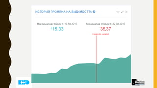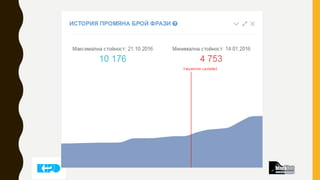 ПОКУПКА НА ДОМЕЙН •Задължително нишов домейн! (ако не е нишов, то единствено правителствен, нпо, асоциации и т.н.) • Най-добрия вариант е да е със съответното разширение за конкретната държава. • Домейни, които са били на кирилица вършат перфектна работа, дори и да не са били .bg • Прегледайте адски внимателно домейна за китайски линкове и други лоши индикатори. • Винаги взимайте домейн, чийто DA по-ниско от PA. И съответно внимавайте за домейни с много висок citation flow спрямо trust flow – това говори за спам. • Внимавайте за прекалено малък брой на referring IP-та спрямо referring domains. Това говори за некачествени линк ферми. • Внимавайте за линкове от сайтове с близък trust flow и еднакъв дизайн. • Не си мислете, че домейна трябва да има над 100 linking root domains, достатъчно е да са 30-40, но да са качествени и от авторитетни сайтове. • Прегледайте дали домейна не е дропван за кратко и с нецензурно съдържание през Archive.org. • Има ли останали страници в индекса (ярък пример за наскоро паднал домейн) • Обърнете се към Калин 