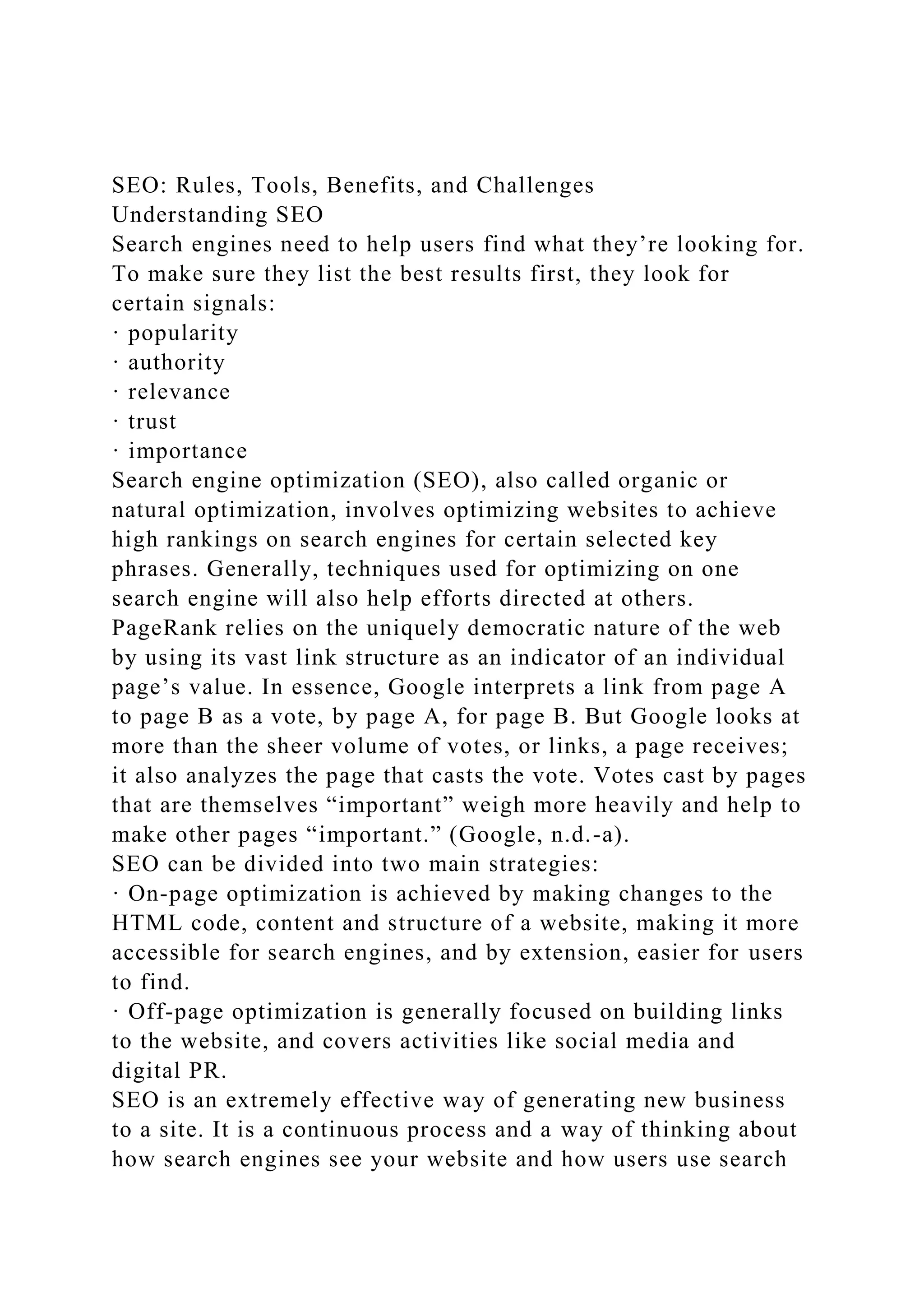 SEO involves optimizing websites to achieve high search engine rankings for key phrases. It can be divided into on-page optimization of HTML, content, and site structure, and off-page optimization like building links. Doing SEO properly entails optimizing the site for both users and search engines to provide a good user experience while getting indexed and ranked well by search engines. Regularly adding fresh, valuable content encourages search engines to crawl the site more and recognize it as authoritative. Black-hat techniques aim to manipulate rankings and should be avoided.