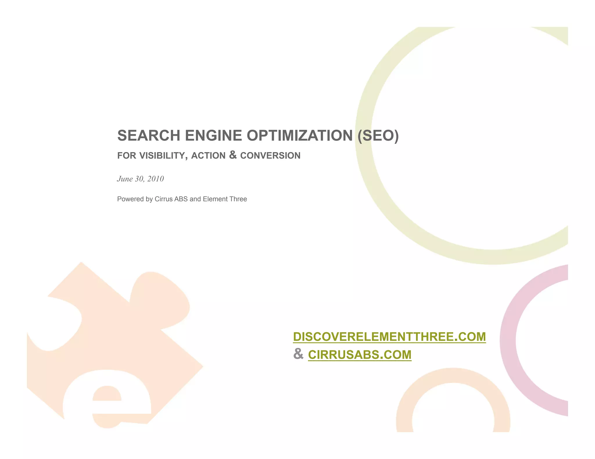 This document discusses search engine optimization (SEO) strategies for improving website visibility and driving online action and conversions. It covers key on-site and off-site optimization factors like technical elements, content creation, social media engagement, backlinks, and analytics to measure success. The goal is to help companies understand how to build successful SEO programs and decide if their efforts can accomplish their goals.