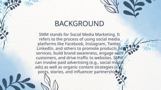 Social media marketing (SMM) utilizes platforms like Facebook, Instagram, and Twitter to promote products, build brand awareness, and engage with customers through a mix of paid advertising and organic content strategies. SMM is characterized by interactivity, targeted messaging, real-time communication, content creation, and cost-effectiveness, with organic marketing, paid advertising, and influencer partnerships as its main types. This approach fosters relationships between brands and audiences while offering various targeting options based on user demographics and behaviors.