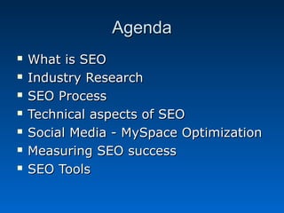 The document discusses search engine optimization (SEO). It outlines the SEO process, which involves discussing business objectives, conducting keyword analysis, optimizing on-site elements like titles and links, off-site optimization, and ongoing reporting. Technical SEO involves comprehensive analysis and optimization of elements like URLs, code, and links. Social media optimization on platforms like MySpace is also discussed. Metrics for measuring SEO success include increased organic traffic and rankings, revenue, and lower reliance on paid search. A variety of SEO tools can aid optimization efforts.