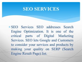 SEO services address search engine optimization and help businesses increase organic search traffic by optimizing websites to match how potential customers search online. Companies are analyzed to understand keywords and content is tailored accordingly. SEO services also include social media marketing to generate traffic, online reputation management, use of organic SEO techniques like keywords and content, and link building which is important but not straightforward. The overall goal is to help businesses increase their online visibility, rankings and reach through search engines.
