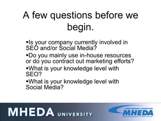 This document contains questions from an executive director regarding search engine optimization (SEO) and social media marketing for their company. The questions cover the company's current involvement with SEO and social media, how SEO can increase profits, low-cost SEO strategies, maximizing organic traffic, hiring in-house vs outsourcing, evaluating SEO contractors, defining social media, determining the most effective social media platforms, security risks, and legal liability for employee social media use.