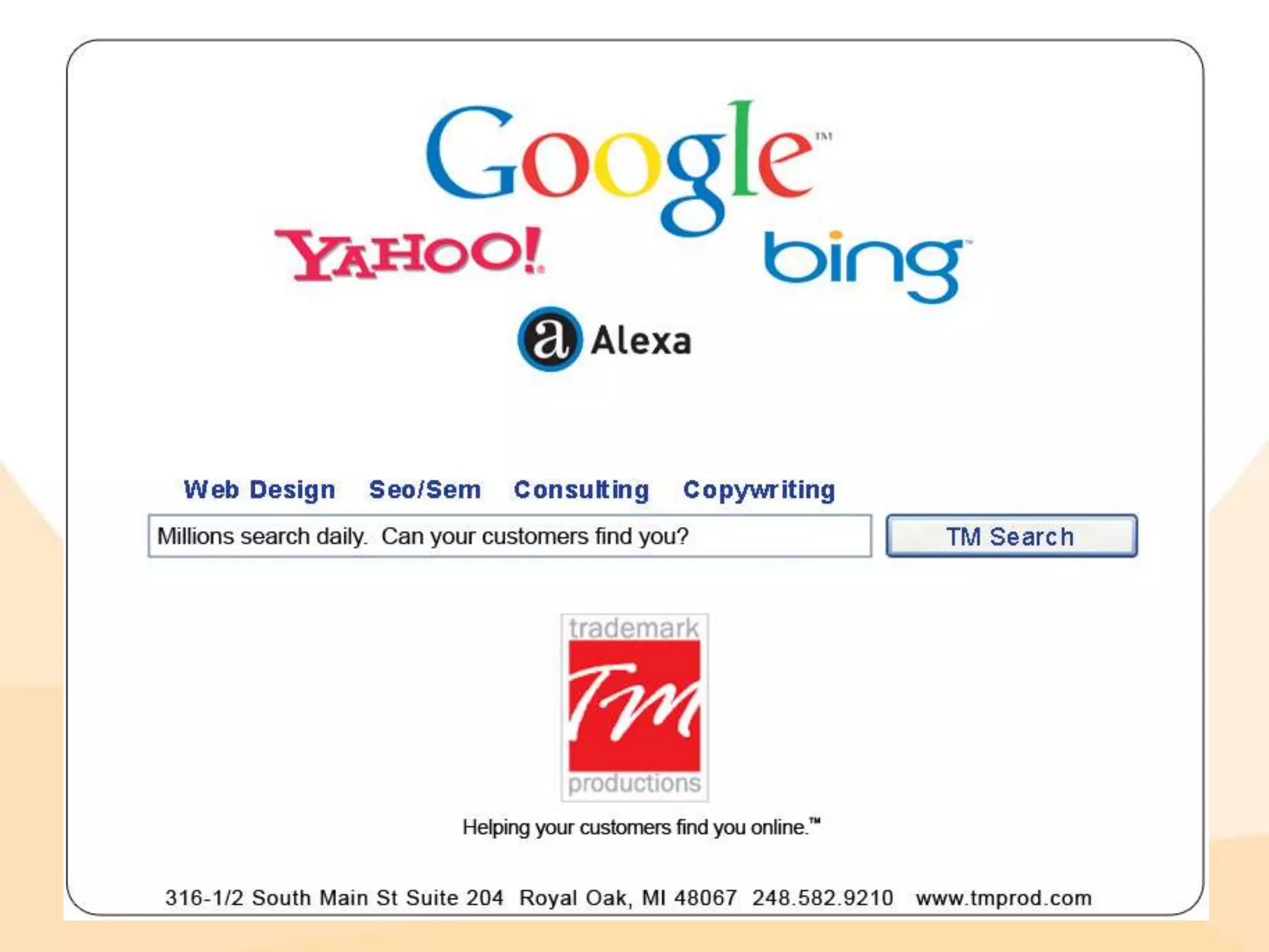 Trademark Productions, Inc. specializes in website and software development, particularly in search engine marketing through SEO and PPC strategies. Their offerings include targeted online advertising solutions to enhance business visibility and drive traffic. Potential clients are advised on SEO best practices, emphasizing the importance of on-page and off-page factors, keyword selection, and effective campaign management.