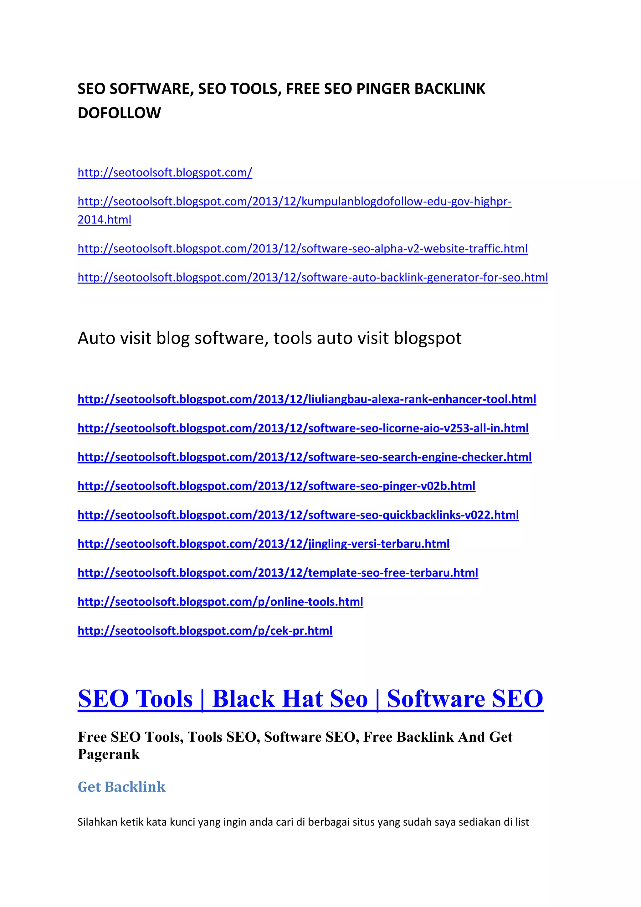 The document provides a comprehensive list of various SEO tools and software, including free backlink generators, auto visitor software, and templates for enhancing website traffic. It emphasizes the importance of obtaining high-quality backlinks through .edu and .gov sites for improved Google ranking. Additionally, the document contains numerous links to tools, software downloads, and tips for optimizing SEO performance.