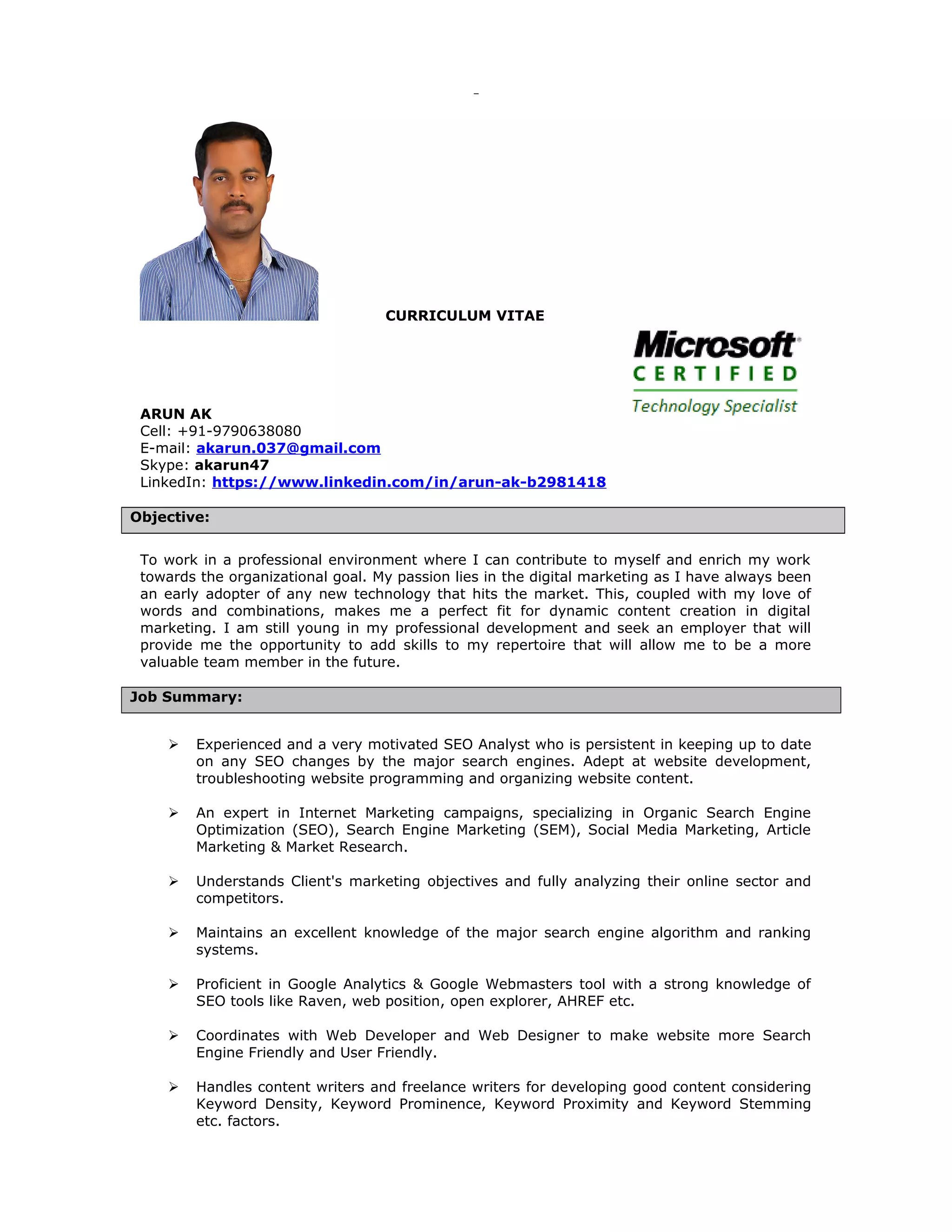 Arun A.K. is an experienced SEO analyst and digital marketing professional with expertise in organic search optimization, social media marketing, and campaign management. He possesses strong analytical skills and tools proficiency, having worked in various roles developing and implementing SEO strategies while maintaining client relationships. Arun seeks to enhance his skills in a professional environment and holds a Master's in Engineering and an MBA, with several relevant certifications.