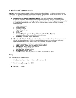 This document outlines an SEO strategy that includes website optimization, keyword research, on-page optimization, link building, and using groundswell marketing techniques. The strategy involves analyzing the site, competitors, and keywords; optimizing pages, titles, descriptions and links; submitting the site to search engines and directories; building internal and external links; and generating online buzz through tactics like press releases, videos, social media, and microblogging to mimic breaking news on the internet. The initial setup and first month of services are estimated to cost $600.