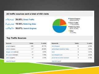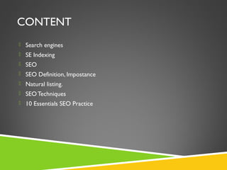 This document contains information about Khirulnizam Abd Rahman, including his contact details and an overview of search engine optimization (SEO) techniques. It discusses SEO definitions, indexing, natural listings, the importance of SEO, and 10 essential SEO practices. Key topics covered include keywords, meta tags, URLs, links, content generation, and analyzing site performance. The document provides guidance on optimizing a website to increase its visibility in search engines.