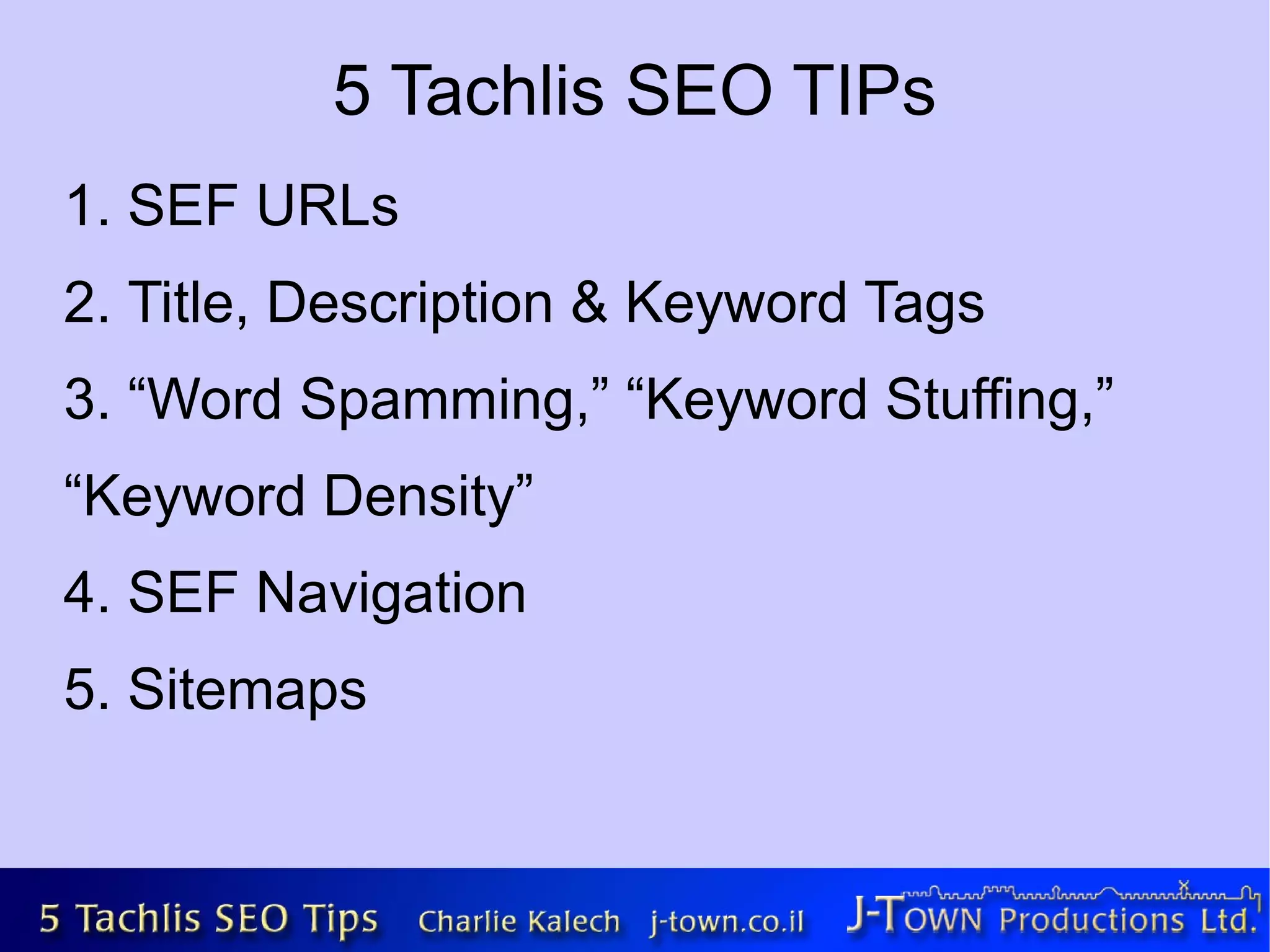 The document provides 5 tips for search engine optimization (SEO): 1) Use search engine friendly URLs (SEF URLs) that include keywords; 2) Optimize title, description and keyword tags while avoiding stuffing; 3) Write content for humans rather than focusing overly on keywords; 4) Use text links for navigation rather than frames or Flash; 5) Include an XML sitemap to inform search engines of site structure. Following these tips can help improve a site's rankings in search engines.