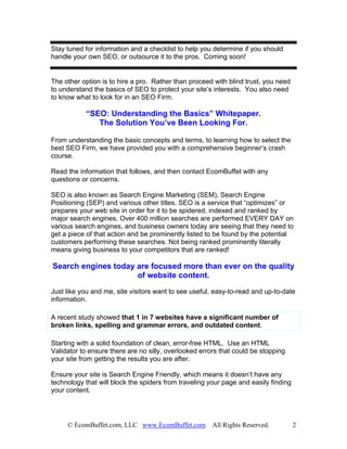 This document provides an introduction to search engine optimization (SEO) for beginners. It discusses the importance of SEO for getting targeted traffic from search engines. It outlines essential SEO components like keyword research, optimized content, title tags, and avoiding black hat techniques. It also discusses how to evaluate SEO firms and asks important questions to consider before hiring one. The document aims to help readers understand the basics of SEO and find an ethical SEO partner to help improve their search engine rankings.
