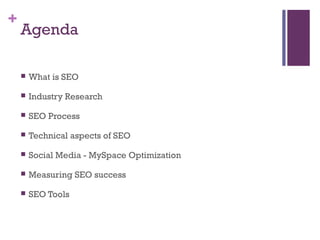 This document is a comprehensive SEO tutorial guide for 2015, emphasizing the importance of search engine optimization for improving web page rankings. It outlines the SEO process, technical aspects, and strategies for success including industry research, the significance of organic listings, and social media optimization. Additionally, it covers methods for measuring SEO success and provides a step-by-step approach to implementing effective SEO strategies.