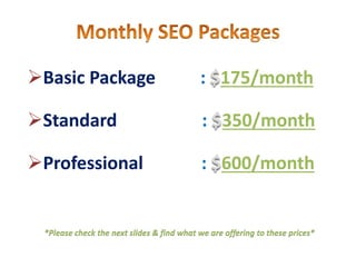 This document outlines monthly SEO package options ranging from $175 to $600 per month. The basic package for $175 includes review of homepage and 3 internal pages, keyword research for 4 keywords, on-page optimization of 4 pages, 2 blog posts, bookmarking 2 pages on 30 sites, and social media profile setup and 2 posts per week. The standard $350 package expands optimization and content efforts. The professional $600 package provides full site review and optimization, keyword research for 20 keywords, on-page optimization of 20 pages, analytics setup, 10 new articles, daily social media engagement, and bookmarking 10 pages on 75 sites. Results may take 3-6 months to be seen.