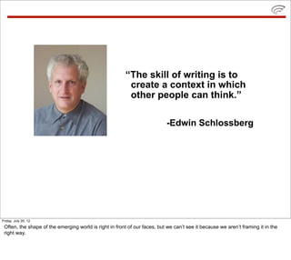 This document discusses the convergence of computing and human potential that is leading towards a global brain. It provides examples like the Google autonomous vehicle, which relies on data from human drivers, and Wikipedia, which is the product of collective human intelligence and cooperation. The emerging global brain consists of humans connected and augmented by technology, working together to solve problems at a massive new scale.