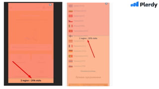 Документ описывает продукты Plerdy для маркетологов, включая инструменты для анализа юзабилити и SEO, а также важные метрики, такие как процент отказов и конверсий. Приведены примеры ошибок в юзабилити и сравнительный анализ трафика на мобильных и десктопных устройствах. Также содержатся рекомендации по оптимизации интерфейса и ссылок на полезные кейсы и ресурсы.