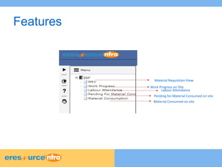 The document outlines the functionalities of the eResource ERP Site Engineer Portal module, which includes features for labor attendance, material requisition, work progress tracking, and pending material consumption. Users can request materials against Bill of Quantities (BOQs), update daily work progress, and capture labor attendance on site. Contact information for the company is also provided.