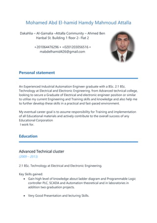 Mohamed Abd El-hamid Hamdy Mahmoud Attalla is an experienced industrial automation engineer seeking a position as an electrical and electronic engineer or similar role. He has a 2:1 BSc in electrical and electronic engineering from Advanced Technical College. His experience includes quality engineering roles at Sumitomo Electric and wiring systems and technical engineering roles at Arabia for Science and Technology Co. He has skills in PLCs, SCADA, automation, problem solving, Microsoft Office, and training. His eventual career goal is to assume responsibility for training and educational materials at an educational corporation.