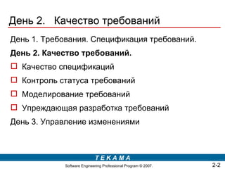 Документ освещает качество спецификаций требований в разработке программного обеспечения, подчеркивая важность их полноты, однозначности и проверяемости. Он рассматривает различные методы управления изменениями требований и моделирования, включая диаграммы потоков данных и варианты использования. Также обсуждаются преимущества использования прототипов для уточнения требований и минимизации изменений в процессе разработки.