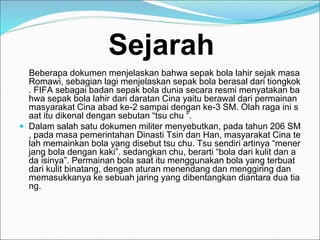 Dokumen tersebut menjelaskan sejarah sepak bola dari masa Romawi hingga berkembang menjadi permainan modern di Inggris pada abad ke-19. Sepak bola berasal dari Tiongkok pada abad ke-2 SM yang dikenal dengan nama "tsu chu", kemudian berkembang di Inggris pada 1857 dengan didirikannya klub sepak bola pertama dan asosiasi sepak bola pada 1863. FIFA didirikan pada 1904 sebagai badan pengatur