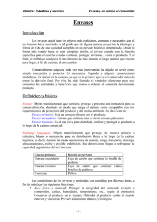 El documento presenta una introducción a los envases y embalajes, definiendo sus funciones y tipos primarios, secundarios y terciarios. Explica que cumplen un rol protector del producto y comunicacional hacia el consumidor. Luego define materiales comunes como metal, papel, vidrio y plástico, detallando propiedades y usos de envases metálicos como latas y características de lacas. Finalmente, analiza el rol del color y factores psicológicos en la atracción y percepción del consumidor.