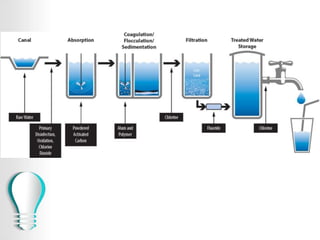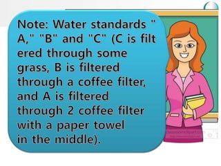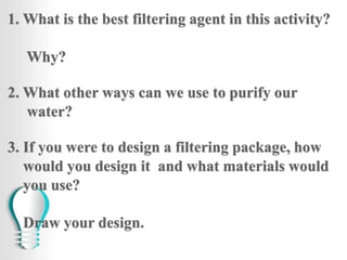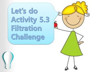 The document outlines learning objectives, content, and resources for a lesson on separating mixtures through evaporation. Specifically, it discusses separating a soluble substance from a liquid using evaporation. It also provides details on a student activity called the "Filtration Challenge" where students are tasked with filtering dirty water samples to specified standards in order to supply filtered water of different qualities and earn corresponding monetary rewards.